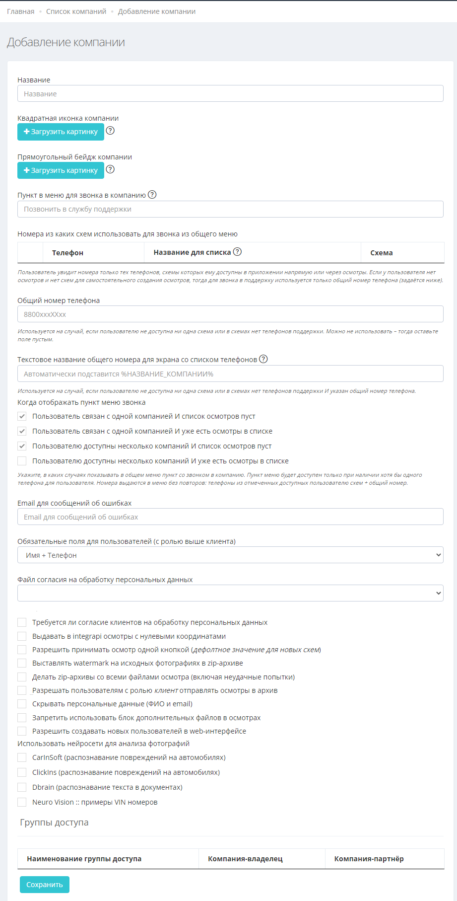 Название - название компании Квадратная иконка компании - маленький квадратный лого компании Прямоугольный бейдж компании - прямоугольный лого компании Пункт в меню для звонка в компанию - пункт в боковом меню в мобильном приложении, ведущий к звонку в компанию Номера из каких схем использовать для звонка из общего меню - все номера, указанные в схемах осмотра компании Общий номер телефона - номер телефона компании по-умолчанию Текстовое название общего номера для экрана со списком телефонов - название пункта меню для звонка в компанию, если таких пунктов несколько Когда отображать пункт меню звонка: Пользователь связан с одной компанией И список осмотров пуст Пользователь связан с одной компанией И уже есть осмотры в списке Пользователю доступны несколько компаний И список осмотров пуст Пользователю доступны несколько компаний И уже есть осмотры в списке Email для сообщений об ошибках Обязательные поля для пользователей (с ролью выше клиента) - какие поля должен заполнить пользователь при самостоятельной регистрации Файл согласия на обработку персональных данных - выбор файла с текстом Согласия на обработку персональных данных пользователя Флаги: Требуется ли согласие клиентов на обработку персональных данных Выдавать в integrapi осмотры с нулевыми координатами Разрешить принимать осмотр одной кнопкой (дефолтное значение для новых схем) Выставлять watermark на исходных фотографиях в zip-архиве Делать zip-архивы со всеми файлами осмотра (включая неудачные попытки) Разрешать пользователям с ролью клиент отправлять осмотры в архив Скрывать персональные данные (ФИО и email) Запретить использовать блок дополнительных файлов в осмотрах Разрешить создавать новых пользователей в web-интерфейсе Использовать нейросети для анализа фотографий: CarInSoft (распознавание повреждений на автомобилях) ClickIns (распознавание повреждений на автомобилях) Dbrain (распознавание текста в документах) Neuro Vision :: примеры VIN номеров Группы доступа - список всех групп доступа компании |