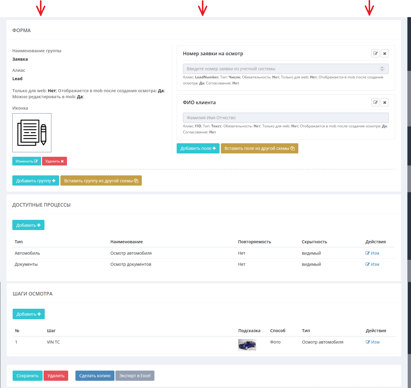 После Сохранения схемы осмотра станут доступны создание и настройка Редактируемых форм, а также Процессов и Шагов Схемы осмотра.