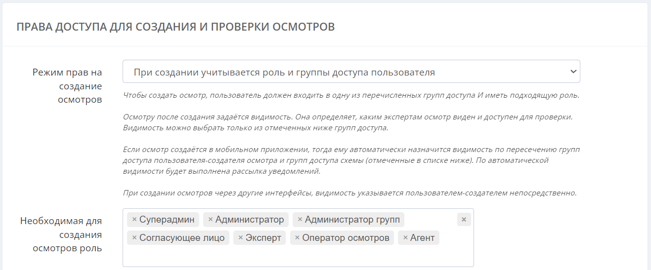 Можно выбрать любые роли, которым будет доступно создание осмотров: