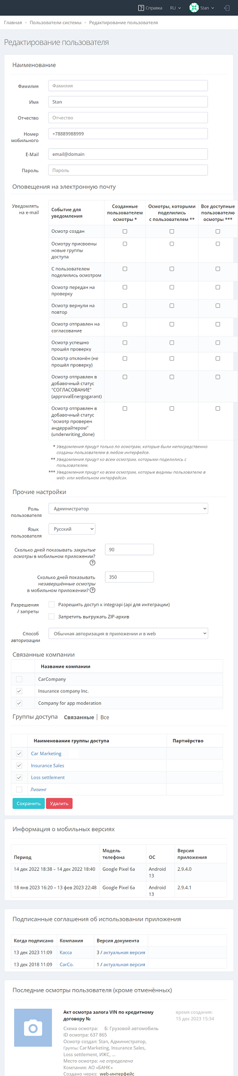 Страница Пользователи системы позволяет управлять профилем пользователя: настраивать доступ к Компании и\или Группе доступа, менять Роль, влияющую на доступность функций пользователя а также управлять настройками уведомлений.