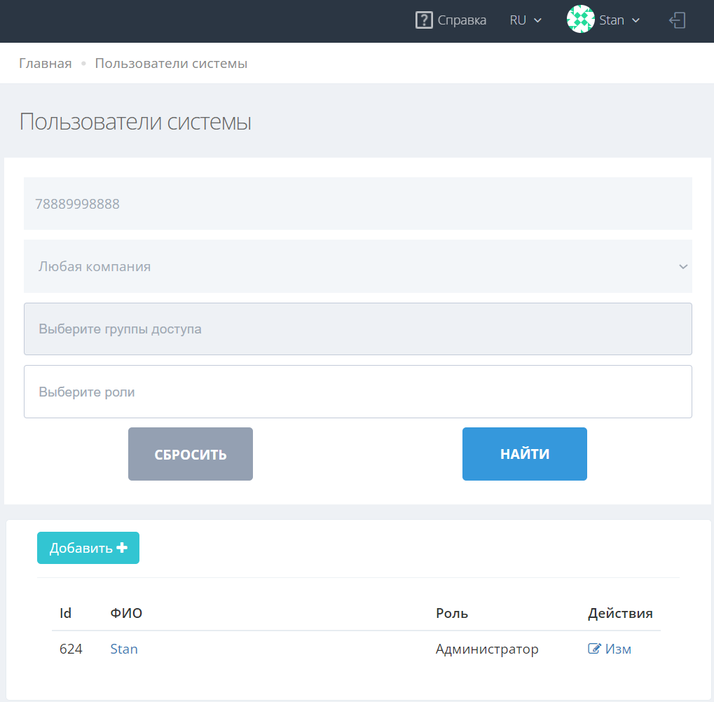 | Администратор может воспользоваться страницей Пользователи системы, найти уже существующего пользователя с учётом Компании, Группы доступа и Роли, а также Добавить пользователя вручную. |