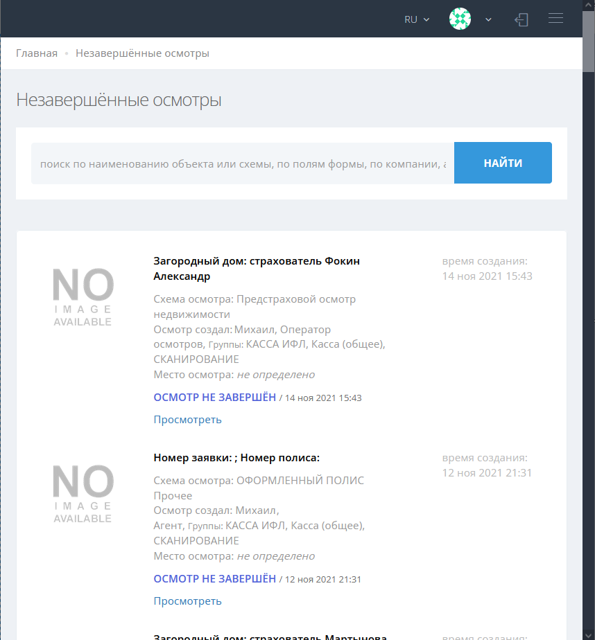 Если в Очереди проверки необходимый осмотр не найден - необходимо провести поиск такого осмотра в списке Незавершенных осмотров.
