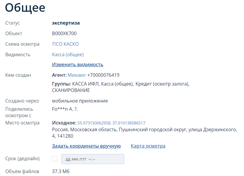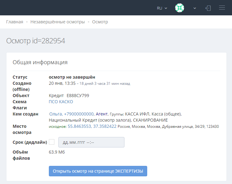 Открываем осмотр и видим техническую информацию по осмотру, а именно: