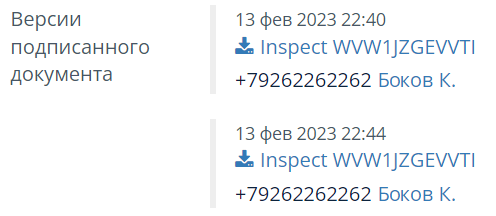 Информация обо всех версиях подписанных файлов, а именно Дата и время подписания, Название подписанного файла, ФИО и Телефон пользователя, подписавшего файл. ![]() |