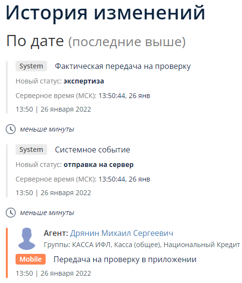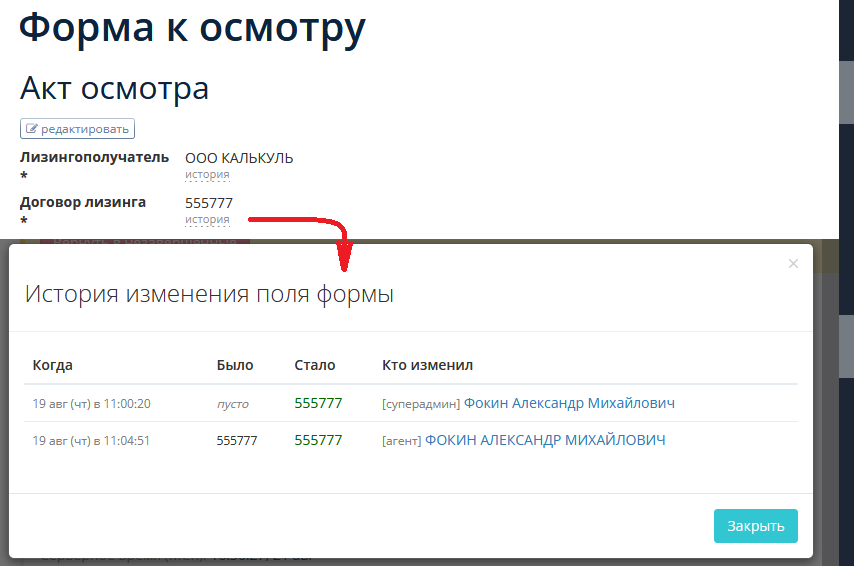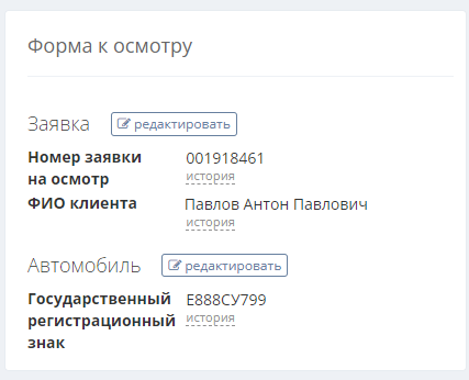 В блоке Истории изменений виден Текущий статус осмотра, а также история предшествующих статусов с указанием их даты и времени.