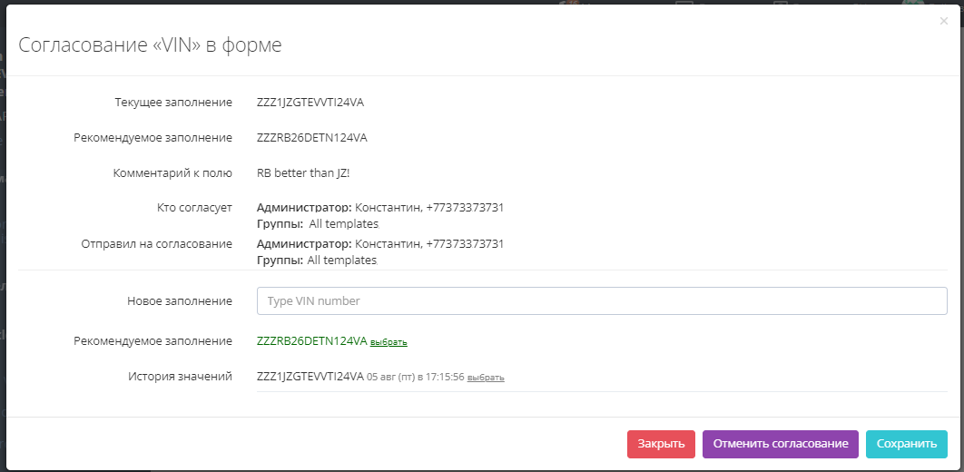 Комментарий к полю - комментарий к согласуемому полю с причиной согласования