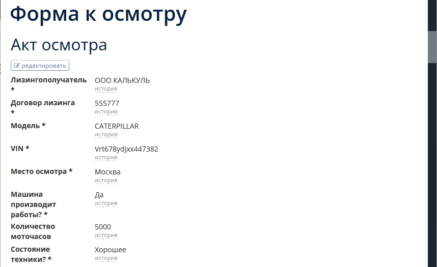 | Сформировать PDF | По нажатию кнопки, система формирует заданную PDF-форму на основе указанных полей формы и выполненных шагов осмотра. PDF-форма выбирается на странице настройки cхемы осмотра. |