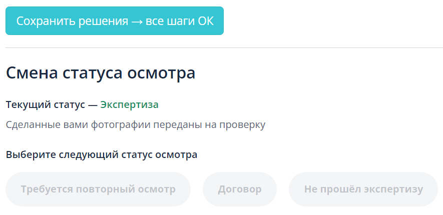 После Сохранения принятых решений по Шагам, необходимо перевести осмотр в один из Статусов: