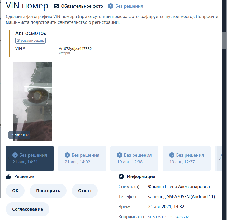 Мобильное приложение позволяет отправлять осмотр на проверку без выполнения данного этапа.