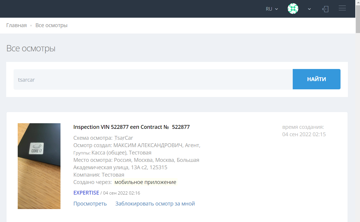 Интересующим осмотр возможно найти по одному из полей Редактируемой формы, например по VIN ТС или Номеру Договора.
