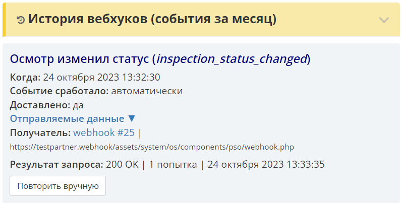 Информация о всех вебхуках, выданных по текущему осмотру. ![]() Подробнее о настройке вебхуков на странице Интеграция в систему Рососмотр |