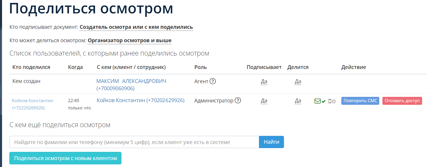 Также в списке возможно индивидуально дать возможность и видеть, кто “Подписывает осмотр” и “Делится осмотром”.
