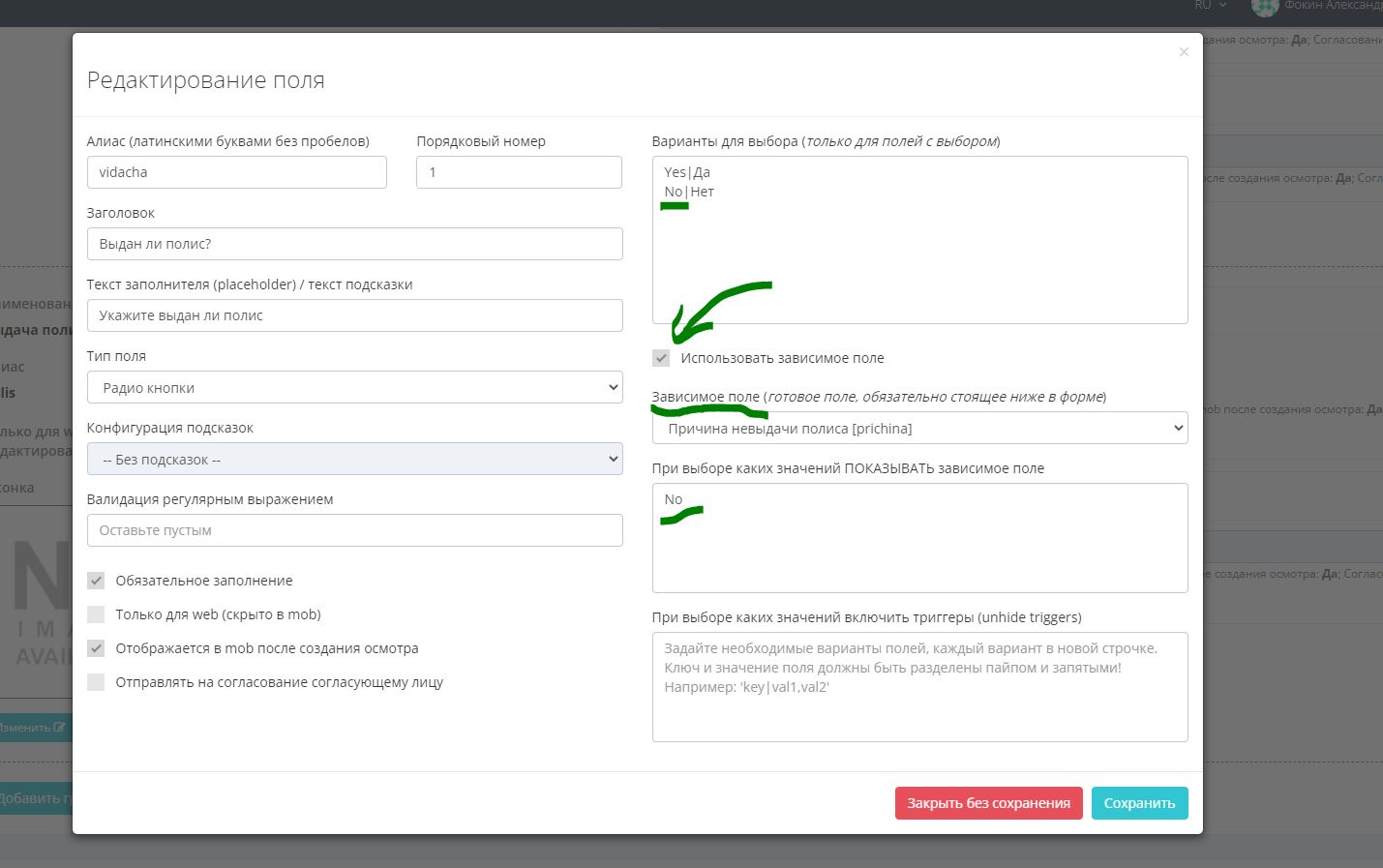 ![]() Логика очень простая: при выборе значения с алиасом “No“ появится зависимое поле, выбранное в поле “Зависимое поле”, которое обязательно должно располагаться в той же группе после текущего поля - в данном случае “Выдан ли полис”. |