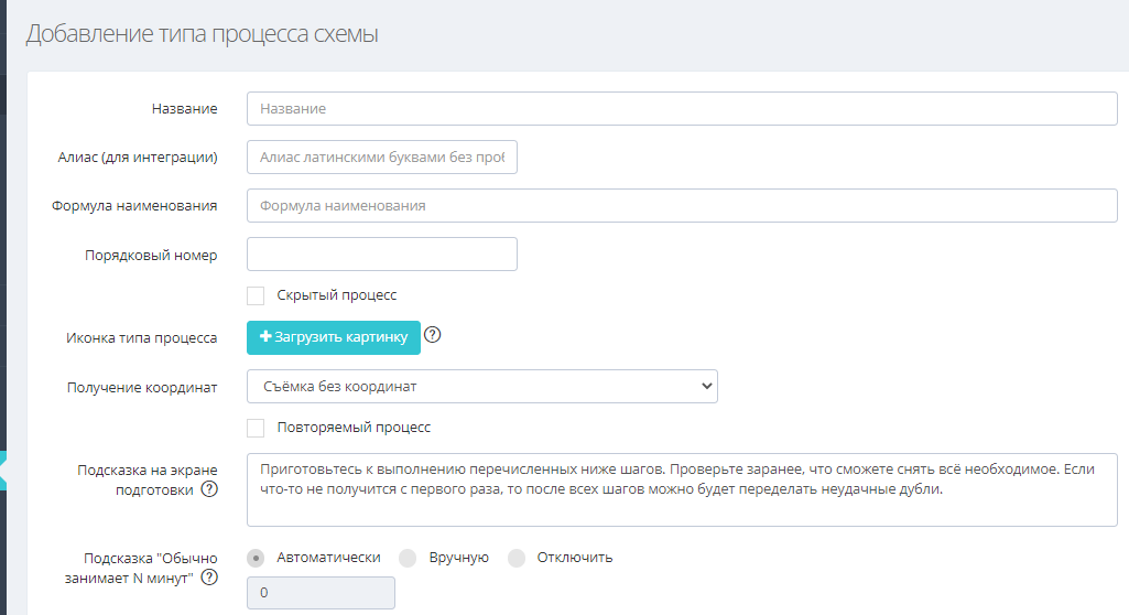 | Минимальное количество съёмок | Для повторяемых процессов пользователь должен будет выполнить минимум указанное количество съёмок. Например, если процесс про "Повреждения", то нужно будет снять минимум N повреждений. И для каждого выполнить все запланированные шаги повторяемого процесса. Укажите 0, если съёмка не обязательна. |