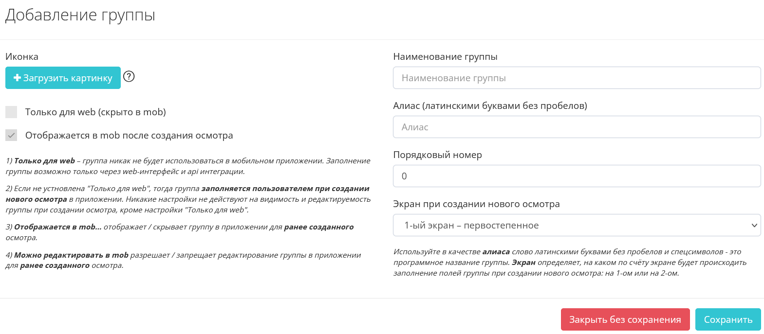 | Можно редактировать в mob | Установка данной галочки разрешает / запрещает редактирование группы в мобильном приложении для ранее созданного осмотра. |