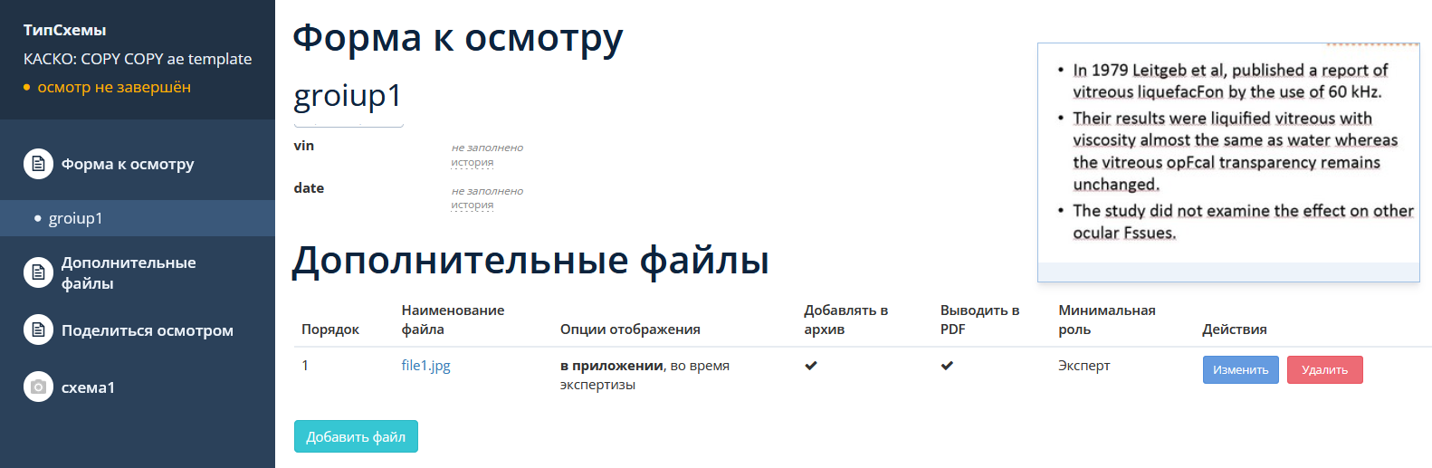 К схеме осмотра могут быть добалены дополнительные файлы. Эти файлы появятся в осмотре созданном на основании данной схемы.