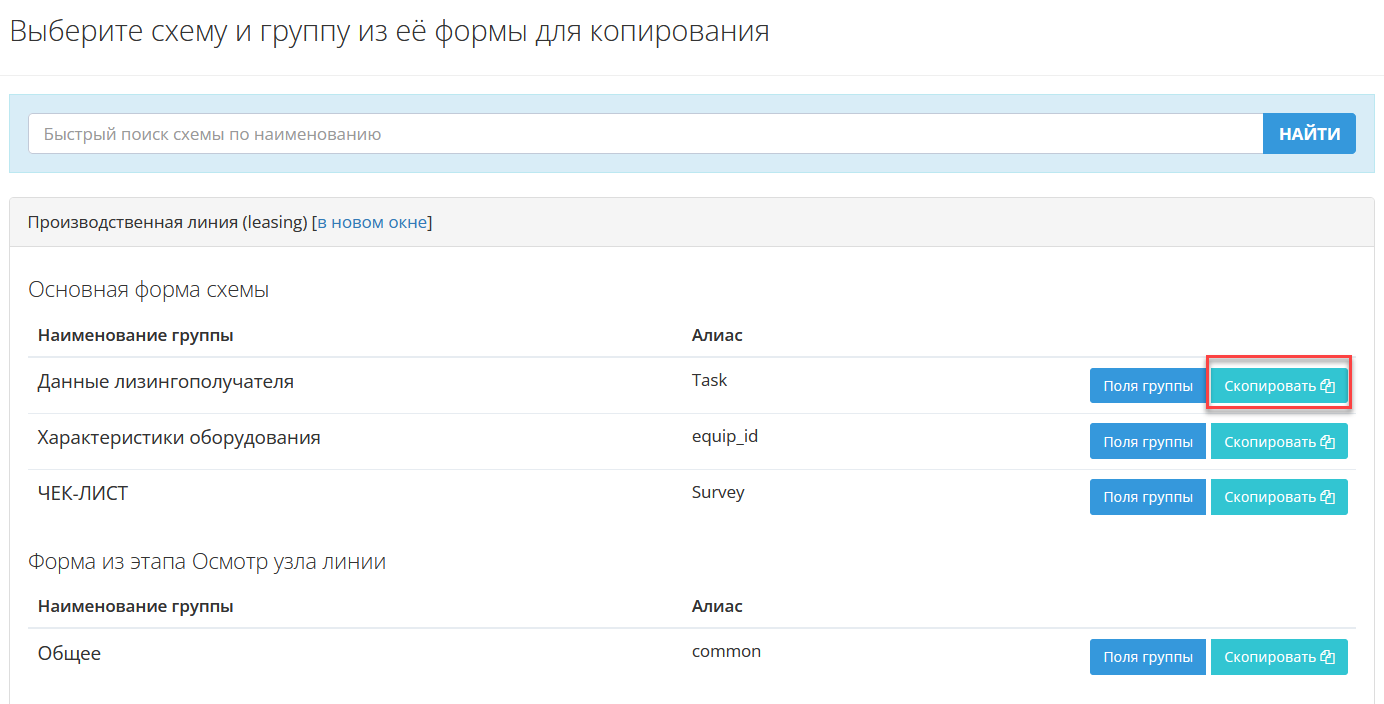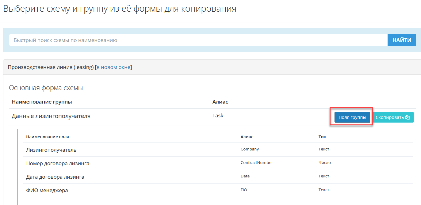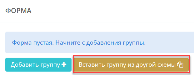 Система позволяет вставить группу полей формы из другой существующей схемы