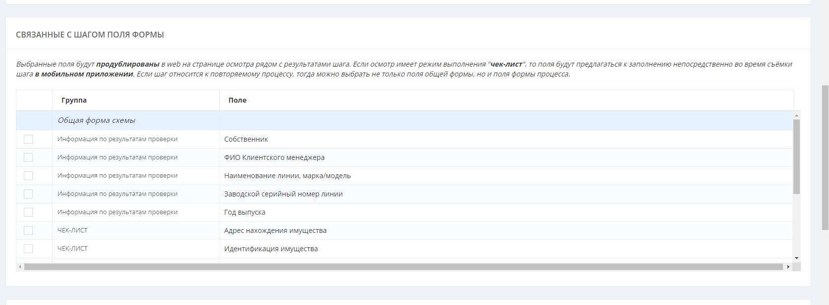 Для режима выполнения осмотра “Checklist” необходимо связать Поля формы с Шагом.
