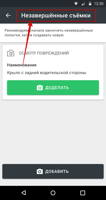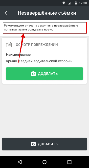 | Подсказка на экране незавершённых съёмок (отображается при попытке создать новую съёмку) |