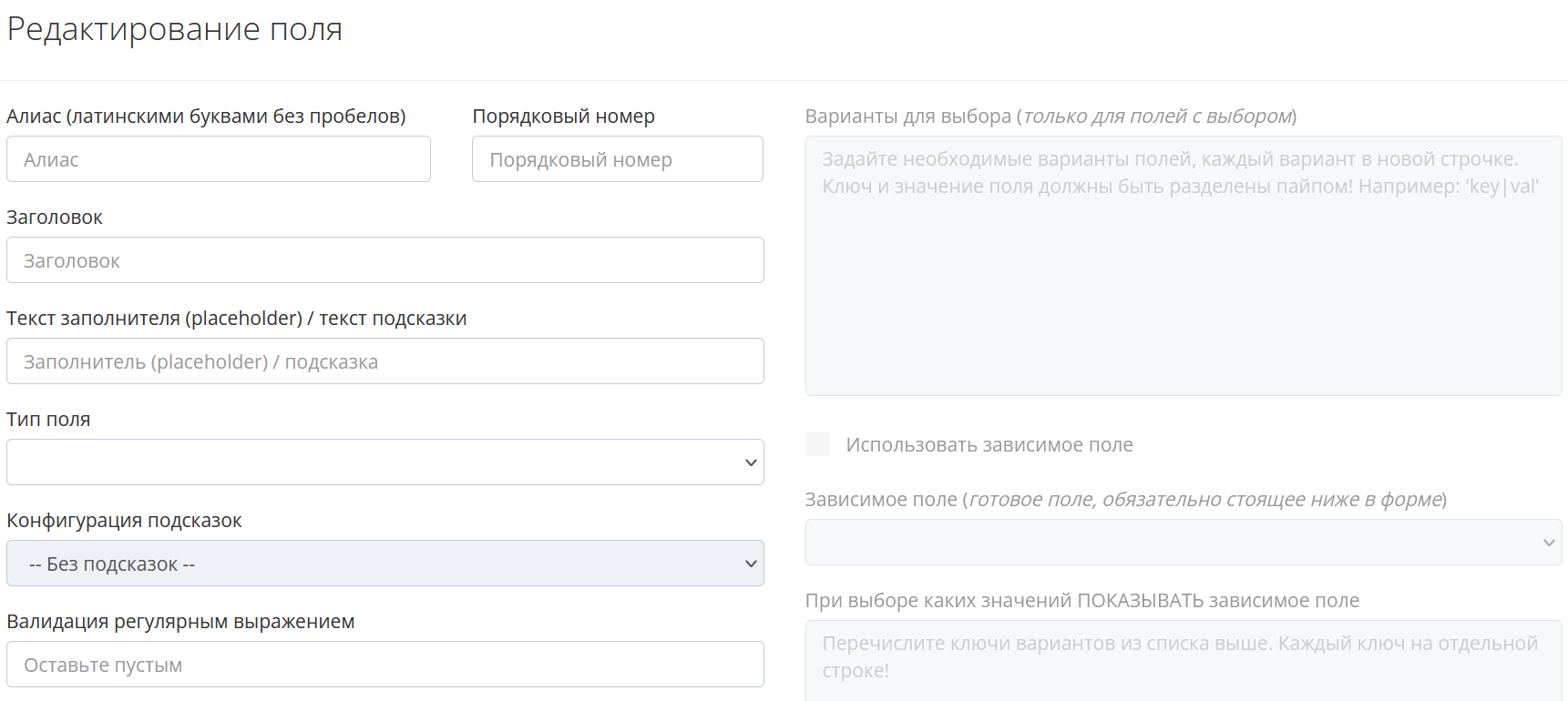 | Зависимое поле | Поле, обязательно стоящее ниже в форме, которое появится, если будут выбраны соответствующие значение основного поля. |