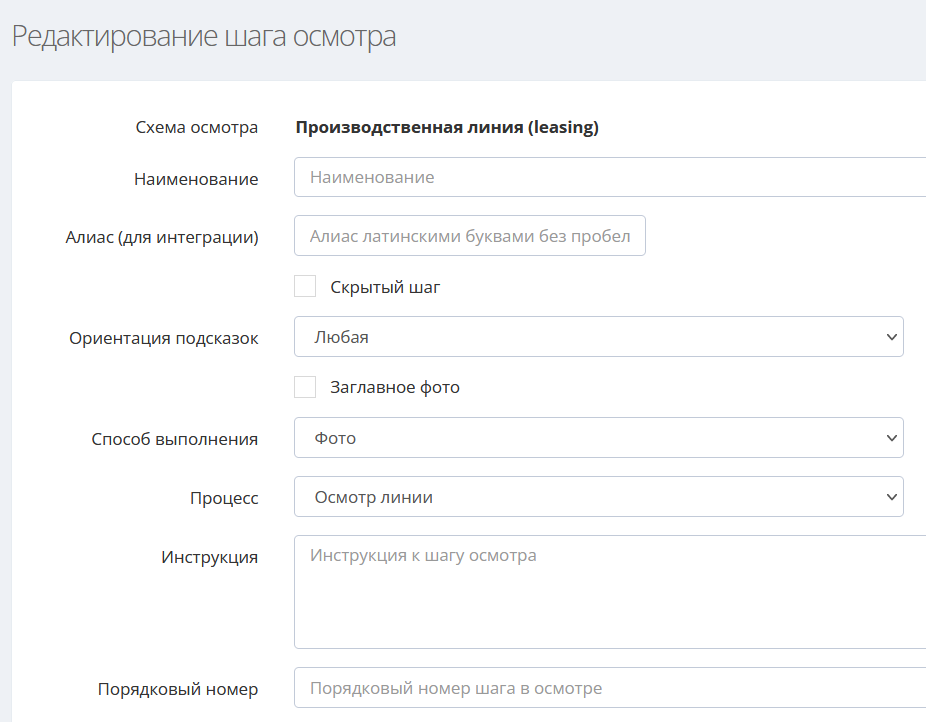 Шаги осмотра – это единичные действия, которые пользователь мобильного приложения должен выполнить при выполнении процесса. Каждый шаг имеет свои настройки и должен быть отнесен к созданным процессам.