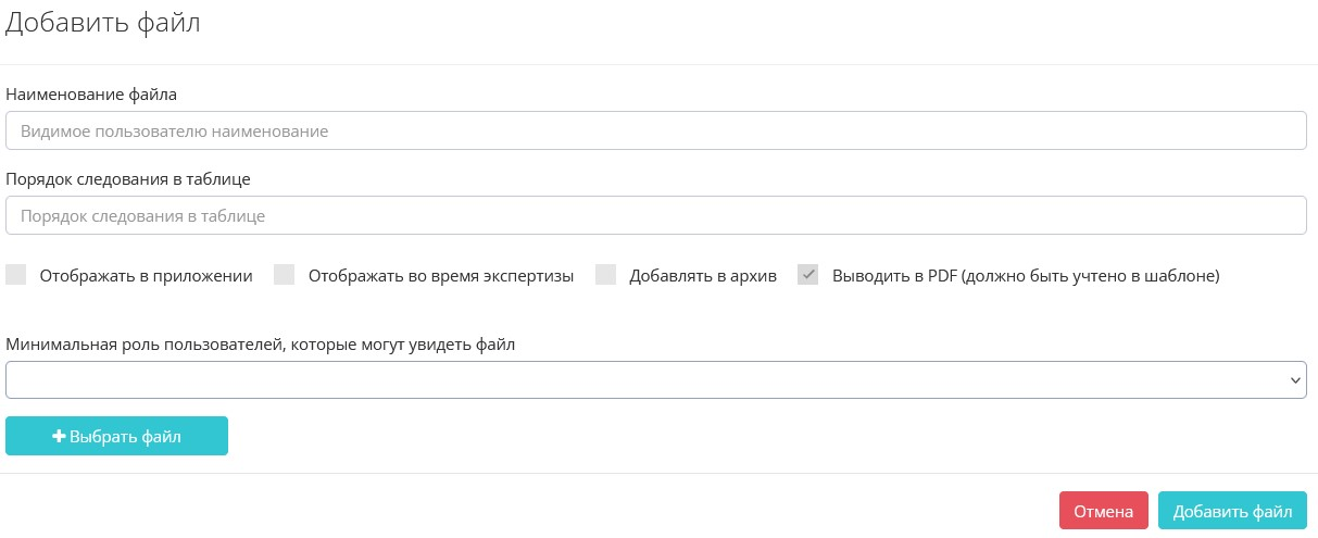 | Минимальная роль пользователей, которые могут видеть файл | Минимальная роль пользователя, который будет видеть дополнительный файл. Пользователи с ролями слабее выбранной файл видеть НЕ будут. |