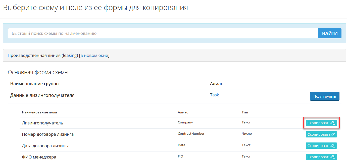 Выбираем необходимую схему и поля группы. Для того чтобы скопировать поля в форму нажмите кнопку скопировать.